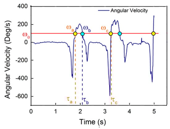 Since a cycle of human walking is composed of a standing phase and a walking phase, the walker’s foot will not move along a fixed direction or at a fixed speed during the entire walking period. The motion of foot in the walking period is cyclic [], and the periodism will be reflected in the change in angular velocity and foot acceleration. In the actual tests, we found that the yaw angular velocity in the heading direction of the walker’s foot during walking is cyclic and has less high-frequency noise than the acceleration. Therefore, we count the step frequency using a method based on the threshold detection of the yaw angular velocity in the heading direction, as shown in Figure 2. We set an angular velocity threshold and a time interval threshold . If the detected angular velocities and , equal to , are at neighboring times and , respectively, with , the follow-up angular velocity detection will continue until the next time , when the corresponding angular velocity satisfies . If holds, a step will be counted. In Figure 2, the counted step points are colored in yellow, and the discarded point is colored in blue. There are two commonly used methods of stride estimation [,]; we use the Kim approach to estimate the stride for a general walker [].