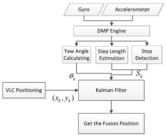 where is the covariance of the VLC positioning coordinate estimates, is the Kalman gain matrix of the k-th time, and is the identity matrix. The algorithm flowchart of the fusion positioning algorithm is shown in Figure 3.
