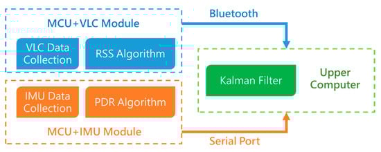 Figure 4 shows the structure of the fusion positioning system we demonstrated in the experiment. Considering that the altitude of VLC positioning module will affect the positioning performance, the VLC-based positioning module and the inertial navigation module we designed are individual modules, respectively, the walker can wear the VLC positioning module on the hand, shoulder, or head, among others, so the walker can hold the attitude of VLC positioning module easily. The VLC-based positioning module and inertial navigation module each send respective localization data to a host computer. In order to provide a portable and wearable positioning system, we use Bluetooth to connect the VLC-based positioning module and the host computer in our experiment, and the inertial navigation module is connected to the host computer via serial port. In the host computer, the fusion positioning algorithm based on an extended Kalman filter iteratively runs to estimate the walker’s position.