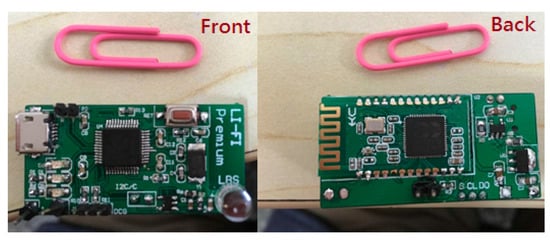 When the system starts to work, it will collect data first; the VLC positioning data will be collected and processed by the VLC module as shown in Figure 5. The PDR data will be collected by the MPU6050 MEMS module as shown in Figure 6, which are tied on the walker’s tiptoe. The module will collect the tiptoe’s inertial movement data and send the data to the STM32F103 MCU by the I2C bus. The MCU will calculate the positioning data to the host computer via serial bus.