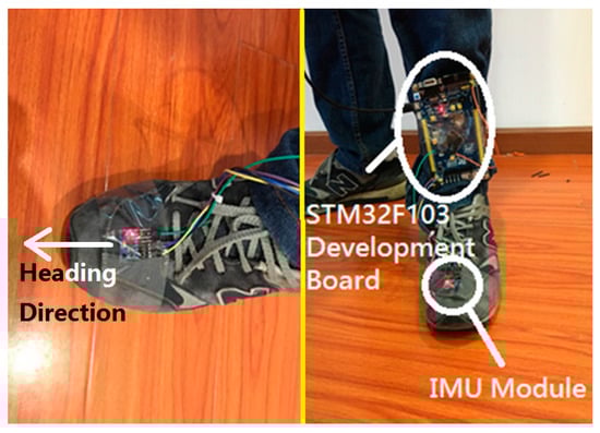 The classic pedestrian dead reckoning (PDR) method was reported in [,]. The PDR automates the self-localization based on the previous known position, the distance traveled and the direction of travel. In this work, a more popular foot-mounted PDR system is employed []. In the PDR system, a digital motion engine (DMP) of an MEMS module is used to obtain the real-time travel direction, and the distance traveled is obtained by a step detection and the stride estimation algorithm. Since the step frequency of an adult is approximately 1–3 steps per second, we employ a 5 Hz low pass filter to eliminate the high-frequency noise from the direction signal. The direction of travel at time k is denoted as . A method based on an acceleration signal pattern has been proposed to detect step frequency in [].