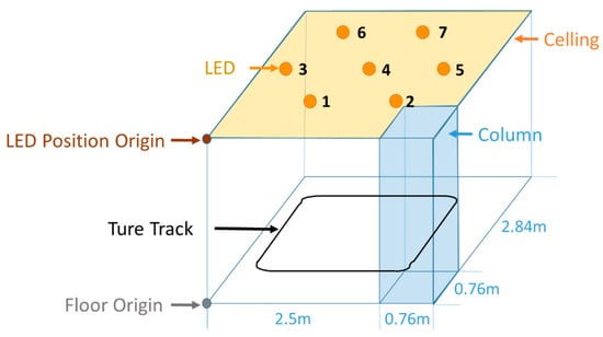 The VLC-based positioning data, i.e., the walker indoor coarse position, is acquired in an LED lighting environment with a commonly used trilateral RSS algorithm [,]. Based on the Lambert model, the channel gain of the LED bulb can be expressed as Equation (1) []:
