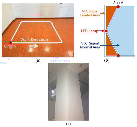 A test walk was conducted in the laboratory. As shown in Figure 7, the VLC positioning available area is a hexagon with a side length of 1.5 m, where there are two sides close to the wall and a corner close to a column. Seven LED down bulbs with a power of 17 W mounted on the ceiling serve as the lighting sources, and the ceiling height is 2.5 m. To set the origin at one corner of the room, the coordinates of seven LED sources in units of meter are (0.93, 0.888), (2.33, 0.888), (0.23, 2.1), (1.63, 2.1), (3.03, 2.1), (0.93, 3.312), and (2.33, 3.312). The walking route is a square with a 2.2 m side length as shown in Figure 8. In order to mimic the longer track, the tester walked two laps.
