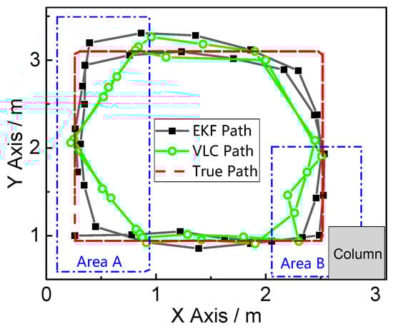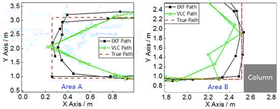 The experiment we conducted can verify the two problems of the classical VLC positioning mentioned in Section 1: the left of this field is named “Area A”, and there are two VLC signal-limited areas, shown as the orange areas in Figure 8b, which are outside of the hexagon area made by the seven LEDs. The VLC positioning module can only receive two LED bulbs’ light signals effectively in the VLC signal limited area, which is why Area A can verify the system’s function in the LED projected hexagon area. The right bottom of this field, named “Area B”, is close to the column shown in Figure 8c. The reflection of the column easily impacts the distribution of a visible light signal. This area can verify the system’s anti-multipath effect function. Figure 10 magnifies Area A and Area B in Figure 9, which indicates that the fusion position system yields superior positioning performance in both areas.