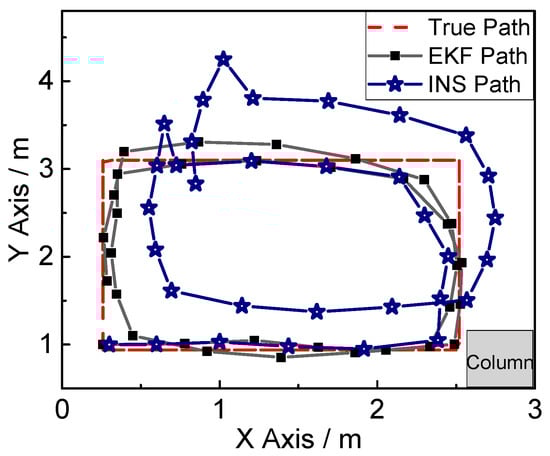 Last but not the least, the positioning result of inertial navigation is shown in Figure 13. The positioning accuracy of inertial navigation is high at the first 3/8 lap, but the positioning error increases in the following route. It is observed that the positioning result after the first 3/4 lap greatly deviates from the true track.
