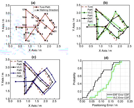 (a) The true path of walking; (b) Fusion positioning and VLC positioning result in a complex trajectory; (c) Fusion positioning and PDR positioning result in a complex trajectory; (d) Error cumulative distribution functions of VLC and PDR positioning.