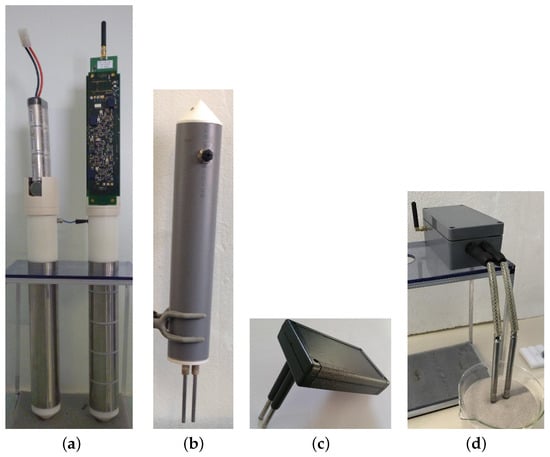 Prototypes developed in the laboratory with same physical principles. (a) multi-channel sensor for vertical profile owing to stacked electrodes; (b) one-channel sensor derived from the multi-channel one; (c) low cost sensor; and (d) one-channel simplified sensor.