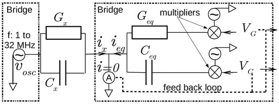 Figure 3 presents the main features of a self-balanced bridge. It results from a collaboration with the firm CAPAAB (Chatenay-Malabry, France). An on-board oscillator provides a voltage at a fixed frequency f—with a choice between 1 and 32 MHz to allow a study of its influence on measurements. The voltage is applied to the admittance to be determined, , and it is used for bridge analog operations. A bridge is a zero method of measurement where the current flowing from the admittance is exactly canceled out by the bridge’s own current. It is automatically generated owing to a feedback loop, multipliers and fixed components, conductance and capacitance . The feedback loop provides the direct voltages and , each used as an input of a multiplier, along with the voltage . Hence, the direct voltages and relation to :