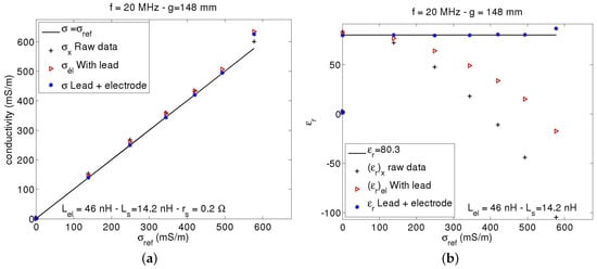 Previous articles only described a calibration process using reference capacitors and resistors placed between electrodes [,]. To determine finely the coefficients introduced above, in particular the residual inductance at fixed inductance , a calibration with air and with water at different concentrations of KCl salt is necessary. Solution conductivity is measured by the conductivity meter C931 of the firm Consort (Turnhout, Belgium). For salinity below S·m−1, the value of water real permittivity remains that of pure water [], taking into account its variation with temperature.