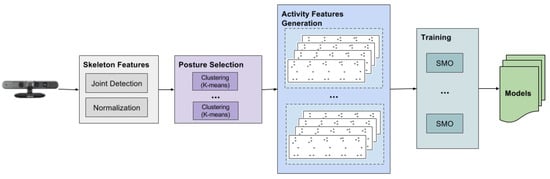 Software architecture of the training phase. The skeleton data are gathered from the depth camera, and the skeleton features are selected and normalized. Then, the input is clustered several times to find the informative postures for the sequence. The activity features are generated from the obtained basic postures, and, finally, a classifier is trained and relative models generated.