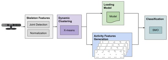 Software architecture of the testing phase. As for the training phase, the skeleton features are extracted from the depth camera. Then, the optimal number of clusters is calculated using the X-means algorithm. A classifier is applied using the previously trained model and the generated activity features.