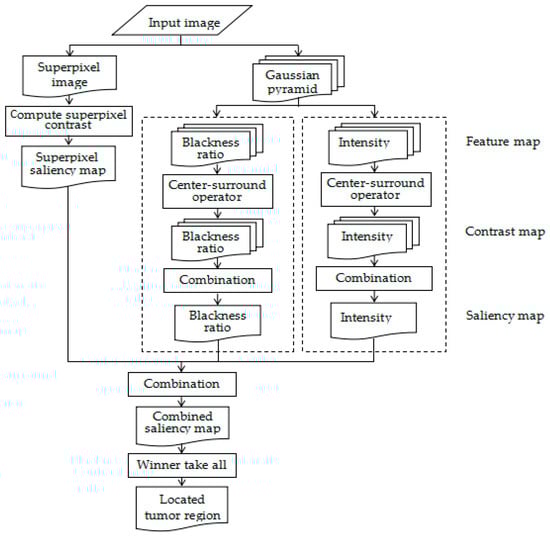 In Figure 3b, a high-intensity area has higher contrast than tumor area, but the tumor area is more salient than other high-intensity regions whose values are near to zero. In the blackness ratio saliency map shown in Figure 3c, the tumor area has the highest saliency compared to any other regions.