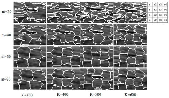 A superpixel is a region that consists of a series of adjacent features with similar color and brightness. Most of these small areas retain the effective information for further image processing and generally preserve the boundaries of the object. We used simple linear iterative clustering (SLIC) to generate a superpixel image [23], in which the gray values and Euclidean distance are respectively used to compute the color similarity and spatial proximity of two pixels. Compared to existing superpixel methods, SLIC has been shown to outperform in respect to algorithm speed, memory efficiency and boundary adherence. Furthermore, the SLIC algorithm has excellent performance. In the SLIC algorithm, parameter K of K-means and compactness m are of importance to the segmentation performance. We discussed the segmentation performance of variant K and m.