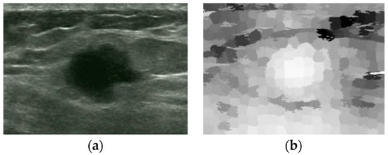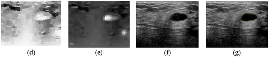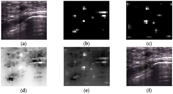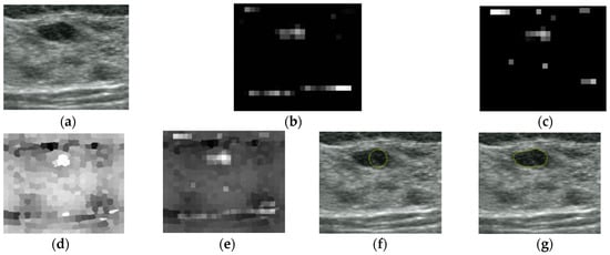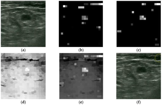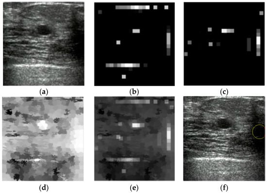 However, in some US breast images, the local contrast of the tumor region is lower than that of some background areas (Figure 13a). In these images, the intensity and blackness ratio features have less contributions to the localization of tumors (Figure 13b,c), in which the high-intensity bottom-right background area and the low-echo background area on the top left hold the highest saliency compared to other areas respectively in the intensity and blackness ratio saliency maps. The superpixel saliency map, in which the tumor has the highest saliency as shown in Figure 13e, devotes greatly to the localization of tumors.