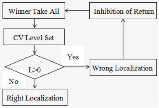 In order to find the second most probable lesion, the Inhibition of Return (IOR) algorithm [16] is applied in our model to inhibit the saliency of the currently attended location to 0. In Figure 10, is the number of junction pixels of the segmented region and image edges. When , the saliency of current-localized region is inhibited to 0 through the IOR algorithm and then find the second-most salient region by the winner-take-all method.