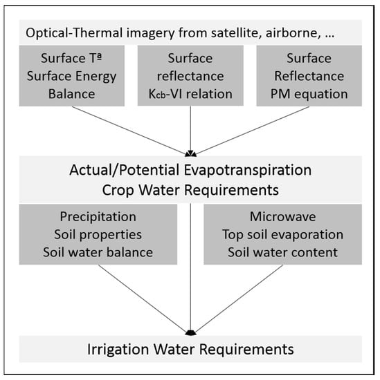 Figure 1. Overview of the remote sensing-based approaches for estimates of evapotranspiration and net irrigation water requirements. The spatial scale of these approaches is related to the pixel size of the utilized image data.
