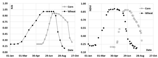 Figure 2. Comparison of the Kcb curves described by Wright, J.L. in 1983 [] for wheat and corn and the temporal evolution of NDVI for both crops in Albacete (Spain) during the 2016 growing season.
