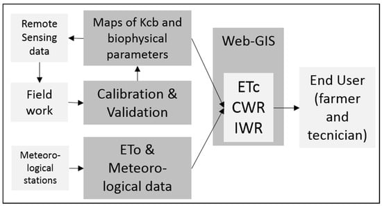 Figure 3. Scheme of the modular system based on the integration of remote sensing and weather observations into a web-GIS, to provide users with irrigation scheduling, matching the water supply to crop water demands. CWR, crop water requirements; IWR, irrigation water requirements.