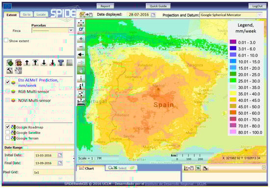 In Southern Spain, a first experience was developed in 2005, by using time series of Landsat 5 images to obtain Kcb curves based on NDVI temporal evolution and displaying them on SPIDER (System of Participatory Information, Decision support and Expert knowledge for irrigation River basin water management, http://maps.spiderwebgis.org/webgis), a web-GIS based on open-source software developed by the University of Castilla-La Mancha. SPIDER has evolved from a 2005 prototype, and it is currently providing time series of Sentinel-2a and Landsat 8 imagery and derived products for the whole Iberian Peninsula, covering Spain and Portugal (around 600,000 km2). SPIDER is able to display time series of raster and vector maps, adding the capability to also display time trajectories of pixel-based values for the periods defined by the user. The main layers displayed by the systems are ETo maps, color composition RGB, NDVI, Kcb and CWR values, 24 hours after image delivery in the web-portals of Landsat 8 and Sentinel 2A by USGS and Copernicus, respectively. The image processing is off-line, and a normalization process allows the operation of multiple image sources as a multi-sensor virtual constellation; see Figure 3. A mobile app version of SPIDER web-GIS (Agrisat App) was released in 2016 and is available in the most common digital distribution platforms for mobile devices.