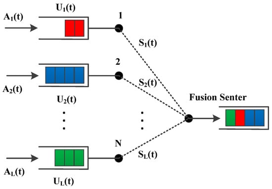 A network model of multiple transmitters and one receiver is included in the current wireless sensor networks [26,27,28]. Provided that data can be sent to the fusion center directly with N nodes and L links, each source node will put packets into the transmission queue in accordance with FIFO principle, as shown in Figure 1.