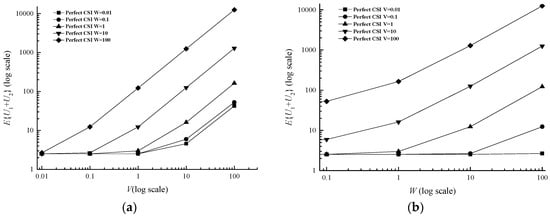 Figure 2. Average backlog versus V and W for a two-queue uplink in the perfect CSI case. (a) Average backlog versus V; (b) Average backlog versus W.