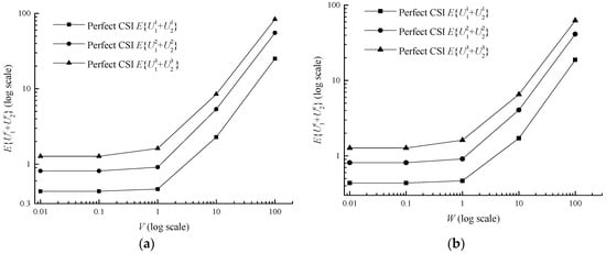 Figure 3. Average backlog with different classes versus V and W for a two-queue uplink in the perfect CSI case. (a) Average backlog versus V; (b) Average backlog versus W.