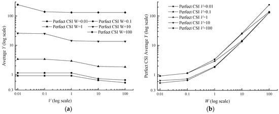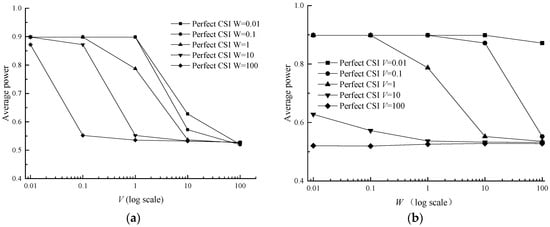 Figure 6. Average power versus V and W for a two-queue uplink in the perfect CSI case. (a) Average power versus V; (b) Average power versus W.