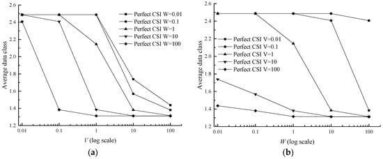 Figure 5. Average data class versus V and W for a two-queue uplink in the perfect CSI case. (a) Average data class versus V; (b) Average data class versus W.