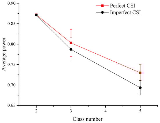 Figure 7. The error bar graph about average power under different class numbers in the imperfect CSI case and the perfect CSI case.