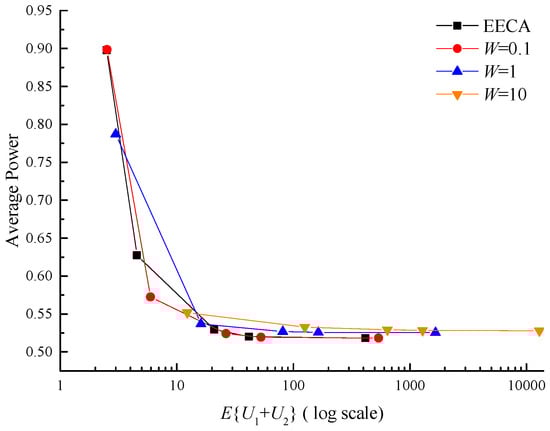 Figure 8. Average power versus average backlog between the proposed algorithm and EECA with 3 different values of W and 5 different values of V. V is 1, 10, 50, 100 and 1000 respectively, and W is 0.1, 1 and 10.