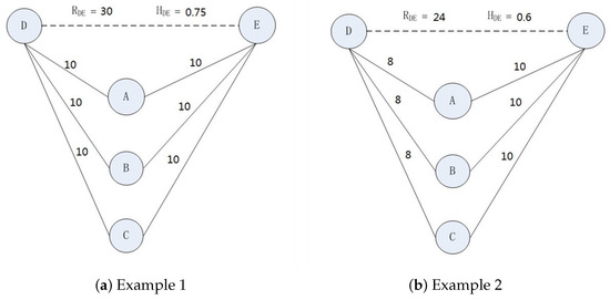 As shown in Figure 1, nodes A, B and C stand for Bob and his parents, respectively, as is mentioned in Section 1, D is the mother of Bob’s mother, and E is the mother of Bob’s father. The encounter times between two nodes are marked with the solid lines. Supposing , according to Equations (3) and (4), we can get and in Figure 1a, and and in Figure 1b. Since D and E do not have direct contact at all, the communication between D and E should be relayed by A, B or C. Therefore, if A, B and C reduce the contact with D or E, the message delivery capability between D and E will have a certain degree of decline. In Figure 1a,b, is 30 and 24, respectively, which reflects the message delivery capability between D and E. Since the contact strength between and D in Figure 1a is more than that in Figure 1b, the message delivery capability between D and E in Figure 1a will be better than that in Figure 1b.