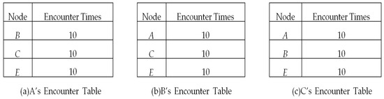 It is supposed that nodes A, B and C have the encounter tables shown in Figure 3, which are used for information exchange with D; thus, D’s information is removed from these tables. Then, nodes A, B and C are going to encounter node D one by one.