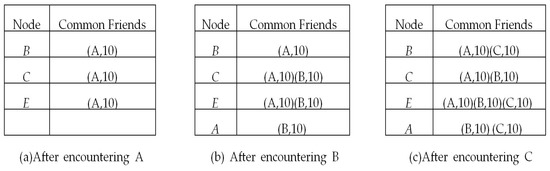 As mentioned above, each node has a common friend table storing the information of common friends with other nodes. When node A encountered D, they exchanged the encounter tables with each other, and node D got the encounter table of A, which is shown in Figure 3a. Because D and A have encountered each other, A becomes one of D’s friends. From A’s encounter table, based on the symmetry of encounter events, A is the friend of B, C and E, and nodes B, C and E have 10, 10, and 10 encounters with node A, respectively. Consequently, we can deduce that node A is one of the common friends of nodes D, B, C and E. Therefore, after an encounter with node A, node D has the common friend table shown in Figure 4a. The first tuple (A, 10) in Figure 4a means that nodes D and B have a common friend A, and the value 10 denotes the encounter times between B and A. It should be mentioned that the encounter times between D and A can be obtained from D’s encounter table. Similarly, after encountering B and C, node D had the common friend table shown in Figure 4b,c respectively.