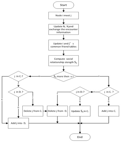 When node i encounters node j, it is supposed that is the strength of the social relationship between nodes i and j at time t, and the parameter is the threshold of social relationship strength for cluster members. Cluster construction and update are discussed as follows according to different conditions of and .