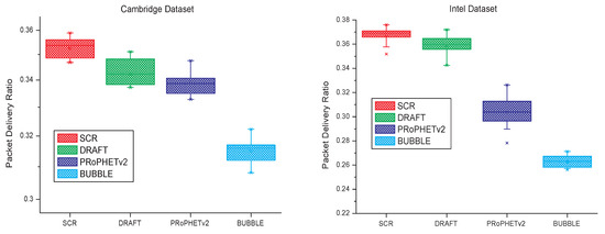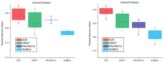 In the simulation, SCR, PRoPHETv2, DRAFT and BUBBLE run in the four datasets respectively, and the simulation time is the duration of dataset, which is shown in Table 1. Simulation results are shown in Figure 6. Similar to [19], quartiles are used to analyze the experimental results. The experimental data is arranged in ascending order and then divided into four equal parts. Then, we can find In Figure 6 there are five signs (min, first quartile, median, third quartile and max) for the result of each algorithm. In some special situations, two or more signs may have the same value. For example, in the first part of Figure 6, to the result of BUBBLE, the first quartile and median have the same value. The quartiles shown in Figure 6 can reflect the distribution center, concentration and spread range of packet delivery ratio. As can be seen from Figure 6, SCR has a higher distribution center of packet delivery ratio than the other three algorithms, a small spread range and a focus on better range.