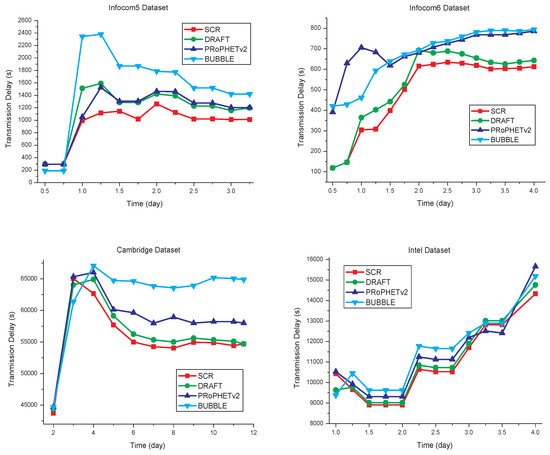 The transmission delay of each algorithm is shown in Figure 8. Compared with the other three algorithms, SCR has the transmission delay decreased by some extent, which is shown in Table 4. Since SCR is cluster-based routing, and cluster members have strong social relationships with each other, it can reduce unnecessary data transmission, and thereby reduce the transmission delay.