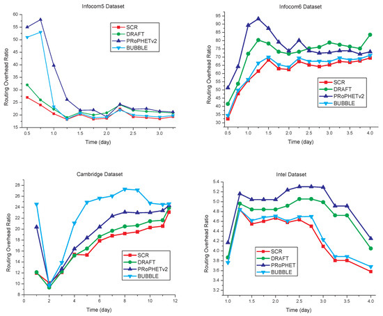 The comparison of routing overhead is shown in Figure 9. Compared with the other three algorithms, SCR has the routing overhead ratio decreased by some extent, as shown in Table 5. Since cluster members have close social relationships in SCR, data transmission has better efficiency than the other three algorithms. In SCR, each node only forwards the copy of the message to nodes that have the destination node as cluster members. Consequently, the total amount of message forwarding is reduced without a negative effect on packet delivery ratio.
