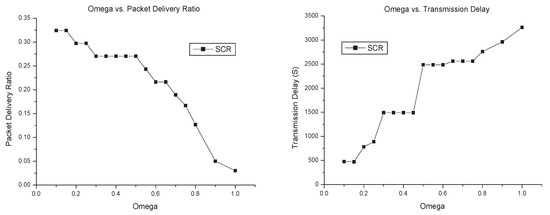 In SCR, there are three parameters: , and n. The parameter is the threshold of social relationship strength for cluster members, and to each node, the size of its local cluster will increase with the decreasing of . The parameter is the referring encounter times for the measurement of social relationship between nodes. In a given condition, the bigger has the smaller value of social relationship between two given nodes. For local cluster constructing, and have a similar effect. On the one hand, with fixed , we can change to let a node join the cluster. On the other hand, to a given , we can change the threshold to have a node join the cluster. It is obvious that changing the value of the social relationship has the same effect as changing the threshold of the cluster for cluster constructing. Consequently, we herein only analyse the impact of on performance. The parameter n is the number of self-decreasing times in the time period T, which is for the social relationship to self-decrease to , as is shown in Equation (8). Given that the simulation time is three days, the performance of SCR in dataset is shown in Figure 10, where is denoted as “Omega”.