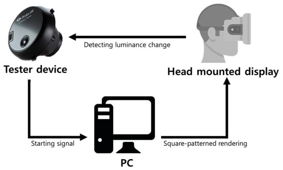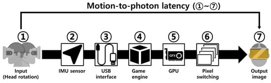 Nowadays, movies and game contents using virtual reality (VR) have taken a center stage because they provide greater immersion and realism. Thus, the VR market is expected to expand rapidly [1]. Especially, the VR environment using a head-mounted display (HMD) is currently in the spotlight as a new growth market because of its reasonable price and accessibility, compared with any other VR equipment [2]. However, HMD devices may have several problems, such as a screen-door effect [3] caused by the low spatial resolution, a frame rate drop caused by the low computing performance, and a blurring artifact caused by the low temporal resolution. Among the problems, the motion-to-photon latency is the most significant one [4] because it results in motion sickness and dizziness caused by the inconsistency of human perception. Specifically, it refers to the difference between the starting time point of the head motion for a new orientation and the time point when generating an image on the display of an HMD system [5]. Figure 1 shows the overall process and motion-to-photon latency of the image rendering in an HMD system. First, the physical head movement occurs, and the head position is measured using an inertial measurement unit (IMU) sensor. Then, an HMD device transmits the measurement data to a PC via a USB connection. The PC generates the changed image in the virtual space based on the measured physical position using the graphics processing unit (GPU). Eventually, a new image is outputted to the display of the HMD system. In this case, each module has a latency, and the total summation of the latencies in the whole process is called the motion-to-photon latency [6,7].