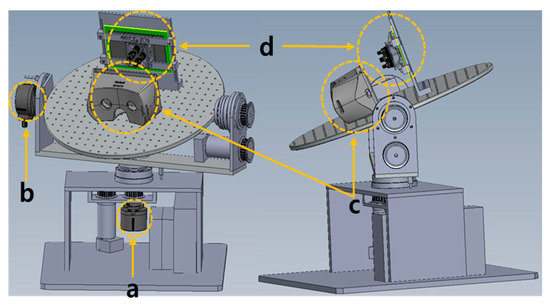Overall architecture of the photosensor-based latency measurement system: (a) a yaw-direction encoder, (b) a pitch-direction encoder, (c) a HMD system, and (d) a plate holding the display of the HMD system.
