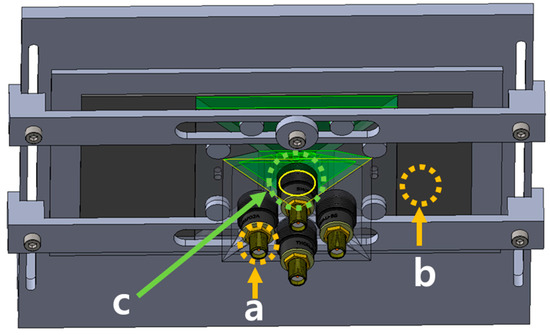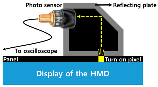 Figure 8 shows the overall architecture of the pixel luminance change detector used in the proposed system. It is placed on the rotary platform. The upper deck supporter of the detector holds the HMD system’s display panel, which outputs the rendered image. Four separate photosensors are used to recognize the direction, and they are located in front of the HMD panel, as shown in Figure 8a,b shows the HMD panel, which outputs the images, and Figure 8c shows a chamber that connects the photosensors and the display panel. Figure 9 shows a cross-sectional diagram of an individual pixel luminance change detector. It blocks the entrance of the external light between a panel and a photosensor, and it only transfers the light emitted from the panel to the photosensor. To measure the low-level change in pixel luminance in the desired position, a small slit where light could enter from the panel to the chamber to generate a darkroom environment.