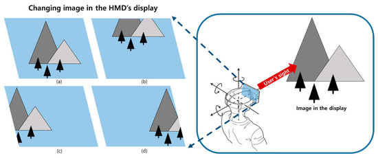 Examples of image changes according to the physical movement of the HMD system: (a) an initial image, (b) an image generated when a user moves down, (c) an image generated when a user moves right, and (d) an image generated when a user moves left.