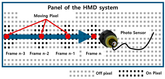 The operation process of the pixel luminance change detection is as follows. The output image of the HMD panel is changed according to the HMD movement, as shown in Figure 10 [15]. The HMD system outputs an image corresponding to the gaze of the user in the virtual space. For example, if a user looks at the front, the HMD system outputs an image like that shown in Figure 10a. Figure 11 illustrates the concept of the pixel luminance change measurement method in the display. A display consists of multiple pixels, and hence, the image movement is represented by on-off pixels. If an object in the display panel moves toward the sensing position of the photosensor, as shown in Figure 11, the on-off switching of the pixel would be changed from the (n-3)-th frame to the (n)-th frame. The changed luminance is converted into a voltage in the photosensor, and this voltage is measured using the oscilloscope. This permits the luminance change in the screen to be measured.