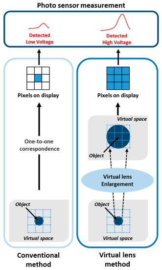 In this case, the luminance change in the virtual space should be considered instead of the pixel luminance change in the display panel because a change occurs in the image of the virtual space based on the head movement. In some cases, the luminance change could not be measured because the pixel luminance change is not sufficient enough to be detected by the photosensor. To solve this problem, a virtual lens technique is proposed as shown in Figure 12. This technique enlarges the pixel luminance as if using a magnifying glass, and hence, can measure the low-level luminance change in a pixel. The typical coordinate mapping between a 3D virtual space and a 2D space is as follows: