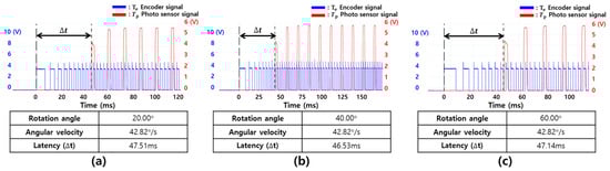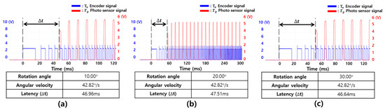 First, motion-to-photon latencies were measured by rotating in the yaw and pitch directions. Table 2 shows the statistical results for the experiment repeated 20 times to measure the rotation angle of the yaw direction. The measured average latencies were almost constant, and the standard deviations were also low. This means that the proposed instrument can accurately measure latency without any deviation. Figure 14 shows the motion-to-photon latency for a specific individual experiment. The blue pulse was generated by the encoder with high resolution, which was used for the physical movement. The red pulse was generated by changing the luminance of the display in the photosensor. The rotation angles were 20°, 40°, and 60°, and the results were 44.61, 46.83, and 46.46 ms, respectively. Each of the standard deviation was also calculated up to 1.45 ms. The latency was measured accurately regardless of the rotation angle in the yaw direction. Next, Table 3 shows the experimental statistical results for the rotation of the pitch direction. In this case, the rotation angles were 10°, 20°, and 30°, and the results were 46.48, 46.79, and 47.05 ms, respectively. The standard deviation was up to 1.09 ms. Figure 15 shows the latency in the pitch direction for a specific individual experiment. These results showed that the proposed measurement system could measure the latency precisely and also showed the reliability of the measurement because of the almost similar results.
