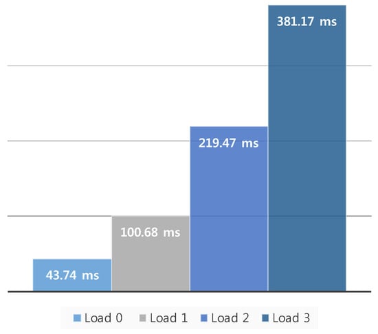 Second, the change in motion-to-photon latency was measured according to the change in the image rendering workload. Generally, the HMD system requires a high-performance GPU because it needs to generate 3D-rendered contents with high resolution and a variety of visual effects. However, the rendering process generates a latency, and this latency is changeable according to the workload for rendering an output image. For example, if an output image is complex in the same hardware resource, the latency would increase. Therefore, in the following experiments, the change in latency was measured when varying the rendering workload in the HMD. The proposed measurement system used a model with a high number of polygons as a basic unit in the Unity game engine to set the rendering workload, as shown in Figure 16a. This model is composed of many textures, as shown in Figure 16b. Generally, the specific indicator that can predict the workload is a vertex. A vertex in computer graphics is a data structure that describes certain attributes such as the position of a point in 2D or 3D space, at multiple points on a surface [20]. Table 4 shows the number of vertices according to the rendering workload change. The rendering workload was gradually increased by increasing the number of vertices. In this experiment, the workload stage was largely divided into four steps. Load 0 was the normal state, with no additional model for the workload in the virtual space. Load 1 used 16 models that had 9.1 million vertices in the virtual space. Load 2 used 32 models that had 20.5 million vertices. Load 3 used 48 models that had 34.2 million vertices. Figure 17 shows the latencies for the different workloads from load 0 to load 3, and the motion-to-photon latency increased up to 381.17 ms when increasing the rendering workload. This means that the proposed device can accurately measure latency changes due to workload changes.