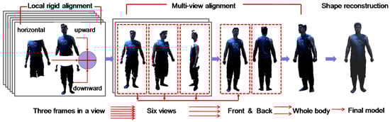 When the 3D scanning is finished in all views, there are only 18 data frames that fully cover the human body. Thus, the computation speed for data denoising and alignment can be greatly enhanced due to the reduced number of frames. The reconstruction pipeline of our method is shown in Figure 2. The captured data frames are segmented from the background with specified depth thresholds and proceed with the necessary denoising of the data. Then, the three captured frames in a view are registered by local rigid alignment to fuse a view frame of the human body. Thereafter, 6 fused view frames are further globally aligned and merged. In the three-step multi-view alignment, the frames in neighboring views are first aligned and then gradually fused into two frames representing the body front and back sides; eventually, these two frames are stitched together to generate a complete data frame for the whole human body.