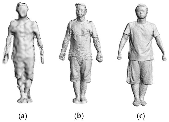 Figure 3. Scanned human bodies from different scanning distances: (a) 2 m distance; (b) 1.5 m distance; (c) 1 m distance.