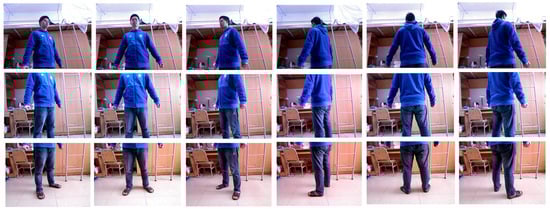 Since the field of view of the Kinect is limited, we use three frames to capture the body in a single view. To realize an automatic capture, the Kinect’s motorized tilt feature is utilized to maneuver between the upward, horizontal and downward views. When the three frames have been captured successfully, the user rotates himself approximately 60 degrees. However, in practice, it is difficult to rotate precisely 60 degrees; thus, the user may rotate five times and evaluate based on perception, which has no influence on the results of reconstruction. That is because our three-step alignment algorithm can handle the rotation angle within 90 degrees. Figure 4 shows an example of the raw captured data of six views, which is a total of 18 frames of images.