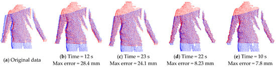 As discussed above, there are alternative methods in correspondence point searching and correspondence distance calculation. We illustrate the result of the method used in this paper and compare its performance with that using the combination of other methods. As shown in Figure 6, Figure 6a is the input of two original point clouds in a single view (the red one and blue one), Figure 6b–e are the aligned results when employing different methods on the same two input data. It can be seen that Figure 6b,e using closest Euclidean distance (CED) in correspondence point searching have faster computation speed than those using the normal shooting (NS) method, while Figure 6d,e, which use the point-to-tangent plane (PTTP) method in correspondence distance calculation, have much better alignment results with smaller maximum error of Euler distance between two aligned frames. Such a comparison shows that the closest Euclidean distance and point-to-tangent plane methods used in this paper can quickly achieve local rigid alignment with good results.